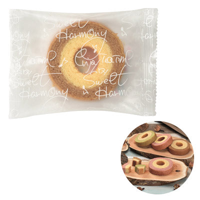 ふんわりしっとりのバウムクーヘン。 ストロベリーとミルクの2層になっています。 お客さまへのお茶請けに最適。