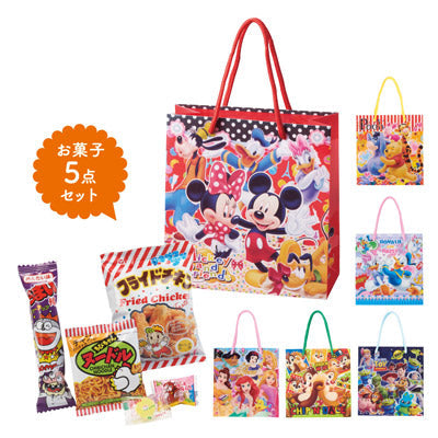 人気のキャラクターがデザインされたバッグと お子様が大好きなお菓子を5点セットにしました。 バッグだけで使うこともできます。