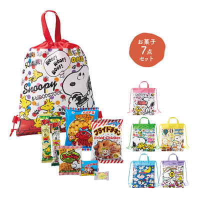 人気のキャラクターがデザインされたバッグと お子様が大好きなお菓子を7種セットにしました。 バッグはトートとリュックの2通りで使えます。