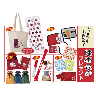 A賞「健康長寿」厚手トートバッグ&「健康長寿」吉兆柄フェイスタオルセット×2、B賞「健康長寿」マルチケース×3、C賞「健康長寿」リバーシブル巾着×6、D賞「健康長寿」まごの手&くつベラ×12、E賞「健康長寿」ポーチ&「健康長寿」ハンドタオル<多幸柄>×27、<付属品>抽選セット(抽選箱・三角く...