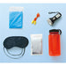 サイズ:1.ウォーターボトル/直径8cm 高さ17.2cm(適正容量/約600ml) 2.レインポンチョ/着丈約100cm 胴回り約165cm(フリーサイズ) 3.アルミブランケット/約140×70cm 4.2WAYライト/直径4.8cm 全長10.3cm 5.アイマスク/約18.5×8.5cm 6.耳栓/全長約65cm