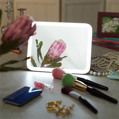 拡大鏡と等倍鏡をコンパクトミラーに。照明は電源をタップすることでオンオフ&調節可能。
