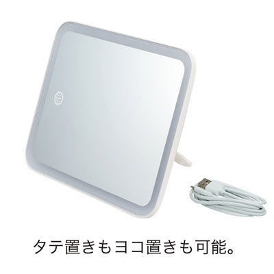 ミラーの周囲が光り、顔を明るく照らします。メイク時に最適。卓上タイプで持ち運びできます。