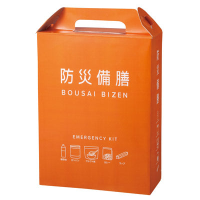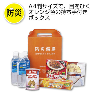 目をひくオレンジ色の持ち手付きボックスに、常備しておきたい食品を中心にセットした防災アイテム。生命維持に欠かせない飲料水をはじめ、長期保存の乾パンや大人も子供も大好きなカレー、避難生活の様々な場面で役立つラップをセットしました。