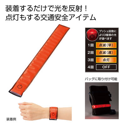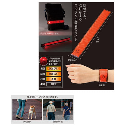 装着しているだけでも光を反射し、スイッチを入れれば点灯もするワンタッチ装着の交通安全アイテムです。腕やバッグ、犬のリードなどにパチンと叩きつければくるっと巻きつきます。スイッチ一つで常灯・点滅1・点滅2の3パターンの光り方に切り替え可能。