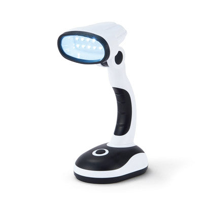 デスクライト兼ハンディライト、12灯のLEDで角度調節可能。このライトは普段はデスクライトとして、緊急時にはハンディライトとして使用できる、一台二役の優れたアイテムです。ヘッド部分には12灯の白色LED電球が搭載されており、角度を調整でき、さまざまな照射角度に対応します。