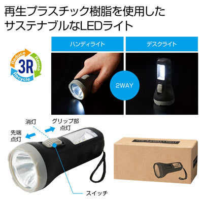 ボディは再生プラスチック製&ライトは寿命の長いLED。ハンディと置き型の2タイプで使用可能。停電など非常時に備えるアイテムとしておススメ!普段使いから非常用まで使える2WAYライトです。先端と側面にライトが付いており、ハンディライトとデスクライトの切り替えは本体のスイッチで簡単に行えます。クラ...