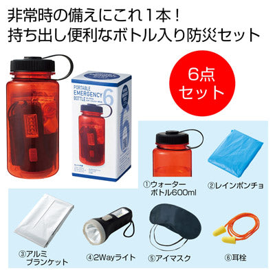 持ち出しやすいウォーターボトルに、非常時に重宝するアイテムをセットしました。各ご家庭で必要な品を追加封入して常備ください。■セット内容:ウォーターボトル(満水容量690ml)、懐中電灯、防寒用アルミシート、マスク、救急絆創膏2枚