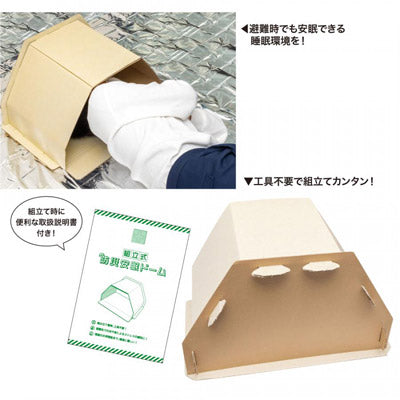 避難先での睡眠時に頭部を覆うことで、光や音を軽減し睡眠の質を向上できる組立式の防災安眠ドーム。独自にデザインした家型のフォルムを採用することにより、圧迫感を軽減しながら独立した空間を確保し、避難所でのストレス軽減にも役立ちます。組立前はダンボールシート状のため、限られたスペースでも隙間保管が可...
