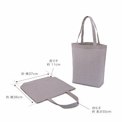 大きさも一般的なトートバッグくらいの大きさになります。底マチも付いていて、様々な用途で活用がし易い仕様です。【リサイクル生地使用】この製品は、工場で回収した裁断くずなどを再利用して作られています。製造工程上、色むらや異なる糸が混ざることがあります。環境に配慮した、地球にやさしい製品です。