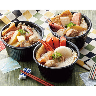 元大相撲力士 舞の海が監修した、電子レンジで温めるだけで手軽に食べられる一人前用の小鍋セットです。紅ずわいがにの旨味がきいた塩味と、鱈や鮭などの具材と相性の良い醤油味、バターのコクが後を引くみそ味の3種類をお届けします。