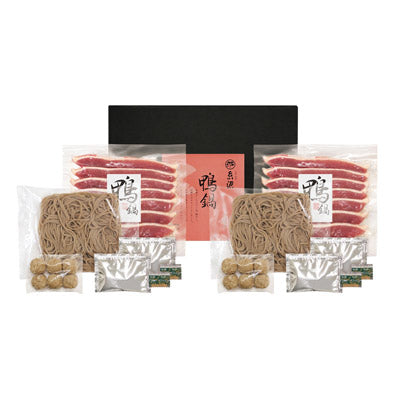 合鴨ロースとつくね、鴨だし、五割そばがセットになった鴨鍋です。お好みで野菜や豆腐などを加えてお楽しみください。使いやすい2人前ずつに分けてお届けします。