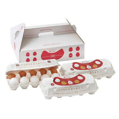 お祝いごとにぴったりな縁起ものたまごです。「幸せの愛でたまご」と「さつまいも愛でたまご」を半分ずつ。