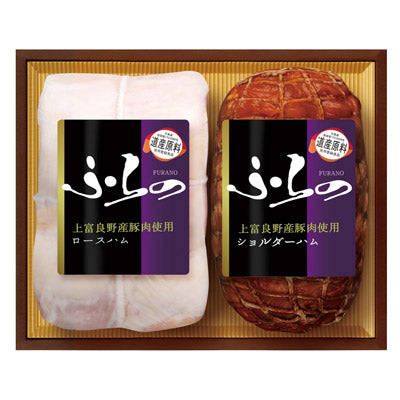 ギフトにもお祝い事にもぴったりです。北海道上富良野産の豚肉を使用したロースハムとショルダーハム2本詰めのギフトセットです。