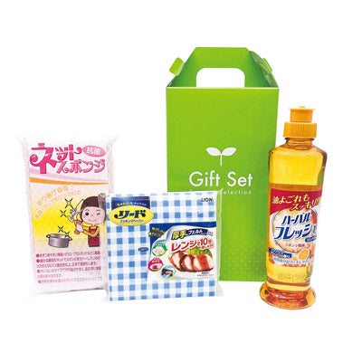 キッチン系/ランドリー系をバランスよくセットした日用品ギフトです。さわやかなデザインの持ち手付き化粧箱入り。