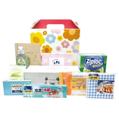 キッチンタオルが入ったボリューム満点の日用品ギフトです。キュートな花柄の化粧箱が目を惹きます。人気のJOYとジップロック入り。