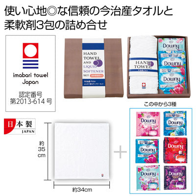 使い心地の良い信頼の今治産タオルとダウニー3包のギフトセットです。ご挨拶の品やお礼の品に最適!ギフトに最適な体裁に整えました。箱をあけた瞬間ふわっと香りが広がります。有数のタオル生産地、今治製タオルは、約34×35cmの使いやすいサイズのハンドタオルです。柔軟剤はダウニーで6種類からランダムで...