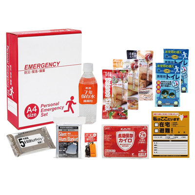 被災当日の1日分の滞在をサポートする災害対策セット。優先度の高い、トイレ・保存水・バランススティック(クッキー)が含まれます。 引き出しや本棚に収納しやすいA4ファイルサイズの化粧箱入。