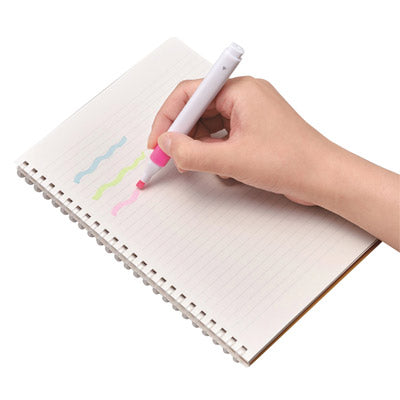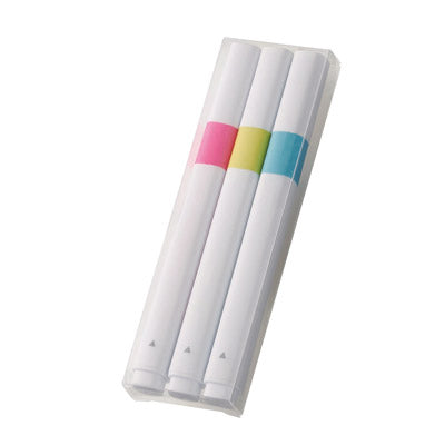 他のペンと並んでも目を引く、ユニークな形の蛍光ペン。ペン本体が白地なので、「映える」名入れでもっとユニークにしても楽しい商品です。 3色セットなのも嬉しいポイント。