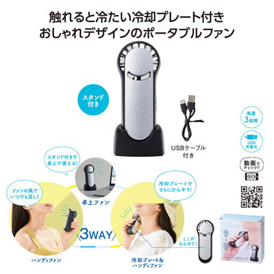肌に冷たさを伝える冷却プレート付きのファン。 スマートなサイズ感で携帯に便利。 スタンド付きなので卓上でもご使用できます。