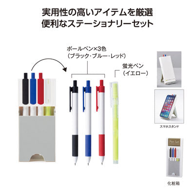 よく使うボールペン3色と蛍光ペン1色のセット。 ペンケースはスマホスタンドとしても使えます。 名入れスペースが大きいので訴求効果も抜群。