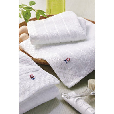 上品な白さの中に光沢糸がきらり。風合いも美しい上質な逸品。日本の伝統柄「市松」と「横縞」を、光沢糸とジャカード織の凹凸により美しく表現。今治ブランド 認定番号:第2022-1469号