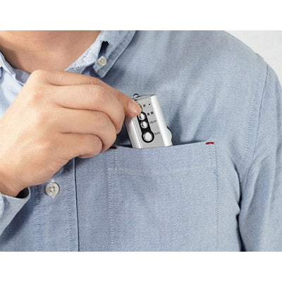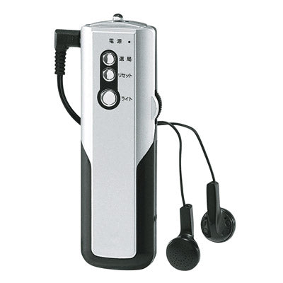 ワイドFM対応!クリアな音質を持ち歩く。ポケットサイズで携帯にも便利。ラクラク自動選局式。両耳イヤホン付き。ちょっと明かりがほしい時にパッと役立つLEDライト付き!ウラ面のクリップで胸ポケットやズボンのポケットに留めておくこともできます。