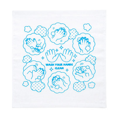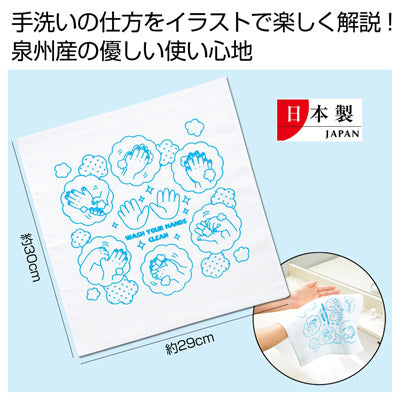 手洗い方法をイラストで楽しく図解♪子どもたちに持たせるならこんなタオル泉州産のさらさら手ざわりが心地いい。厚さ約0.8cm/重量約27g(※必ず現品でご確認ください)でポストインに最適。