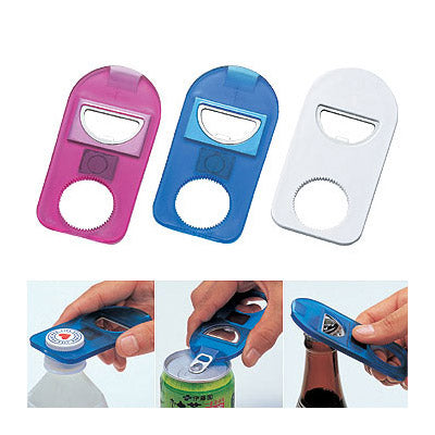 栓抜き、ペットボトルオープナー、プルトップオープナーの機能の付いた複合オープナーです。背面にマグネットが付いていますので、冷蔵庫などにピタリと付きます。