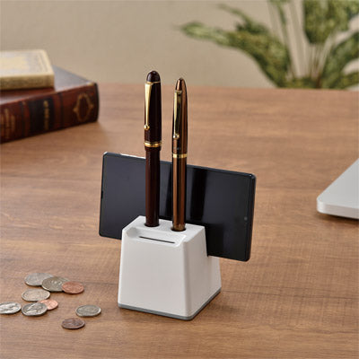 貯金箱にペン・スマホスタンドをセット。いつも目の前にあればコツコツと貯められるかも。