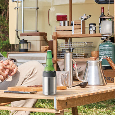 真空二重構造で保冷効果を発揮。冷えた缶やビンをそのまま入れて使えます。上部のゴムがすべり止めに。