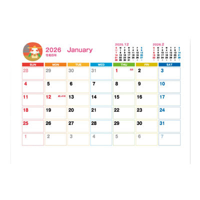 2026年 卓上カレンダー。インデックスが付いて使いやすく、先月・翌月・翌々月を表示。配布用カレンダーにぴったりなカレンダーです。見たい月がすぐに探せるインデックス付き。干支柄(午)の表紙の卓上カレンダーです。六曜表示、見やすい4か月表示のカレンダーです。名入れもご相談ください。