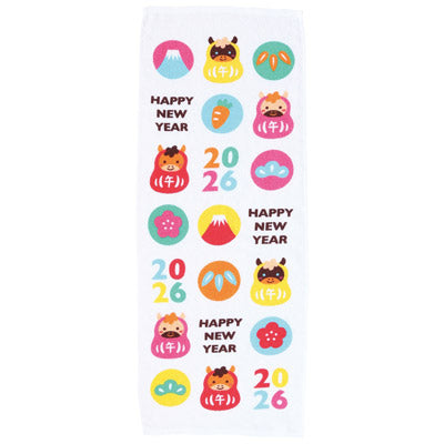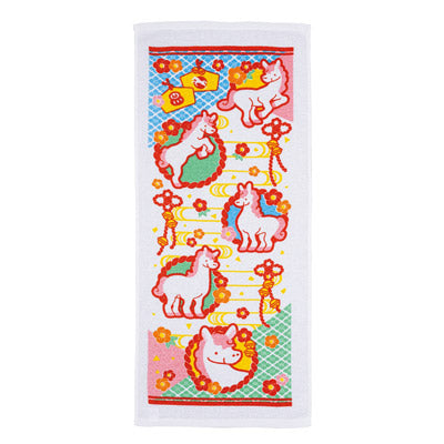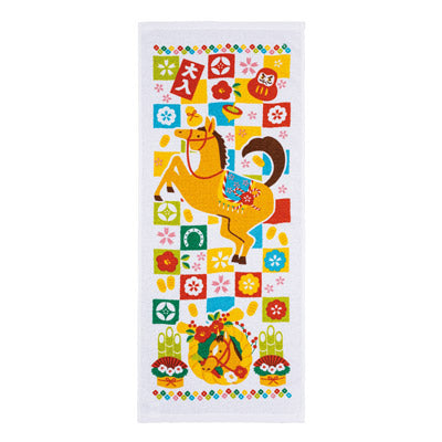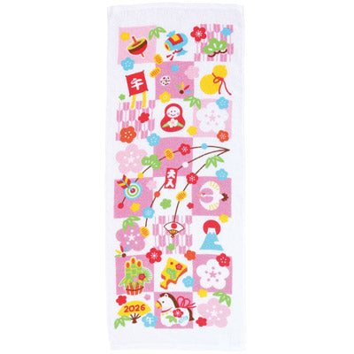 縁起を贈る、迎春のご挨拶に。2026年の干支タオル。七福神・紅梅・市松の3柄展開で、縁起の良いモチーフが一年の始まりを華やかに彩ります。使いやすい約34×86cmサイズで、実用性も抜群。季節のご挨拶や販促品として、お取引先やお客様への感謝を込めた贈り物に最適です。