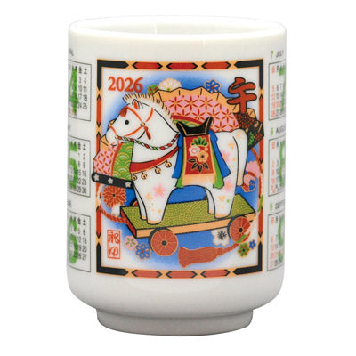 縁起の良い干支の日本製の湯呑です。年間カレンダー付き。