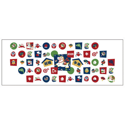 干支絵柄をあしらった華やかな干支手ぬぐいカレンダーです。年末年始のノベルティに最適です。綿100%で織られた手ぬぐいは、吸水性が高く、速乾性も良く、薄手でかさばらないので携帯に便利です。日用使いだけでなく、タペストリーとしてもご使用いただけます。