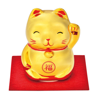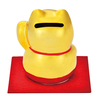 ご縁を招く左手上げの招き猫の貯金箱。金運も招いてくれそうな輝く金色!100円硬貨なら約90枚、500円硬貨なら約50枚収納できます。貯まったら底面のゴム蓋を外して取り出せます。