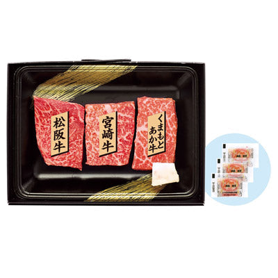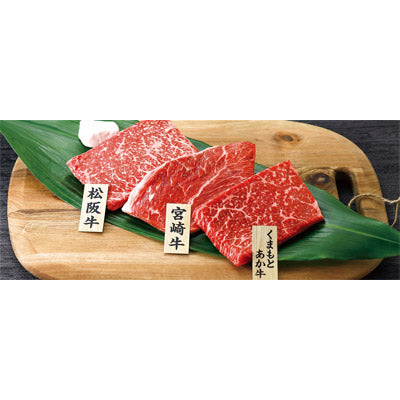 銘柄牛3種それぞれの肉質、赤身肉の美味しさをお楽しみください。松阪牛(三重県)・宮崎牛(宮崎県)・くまもとあか牛(熊本県)のもも肉をステーキ用にカットしてお届けします。