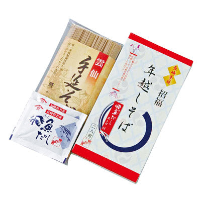 来る年の招福を祈願して作られた商品です。製麺技能士によって、380年の伝統で日本名水百選の雲仙岳の伏流水と独自の原料を使い作り上げた貴重な手延そばと長崎県近海の美しい海でとれた新鮮なあご(飛魚)のスープの詰合せ。