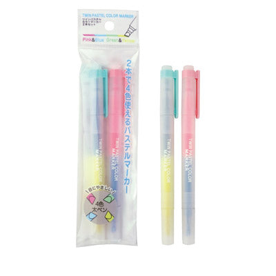 1本で2色使えるツイン式カラーマーカー2本セット。目に優しいパステル系インクです。ピンク&ブルーとグリーン&イエローの計2本入り。お子様や学生向けに。