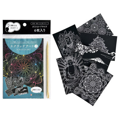 はがきサイズの大人向けスクラッチアート。付属の専用ペンで印刷された白い線を削っていくだけで素敵なカラフルなイラストができる商品です。カラータイプ6種のデザインが各1枚と専用ペン1本がセットになっています。
