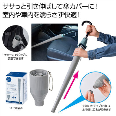 シュコッと伸ばして濡らさない!雨の日の長傘の持ち運びを快適に。濡らしたくない車やタクシー、周囲に迷惑をかけたくないバスや電車の乗車時はもちろん、店内に入る際にも使い捨てのビニール傘袋を使わずに済みます。付属のチェーンでバッグなどに下げておけるので使いたいときにサッと取り出せます。