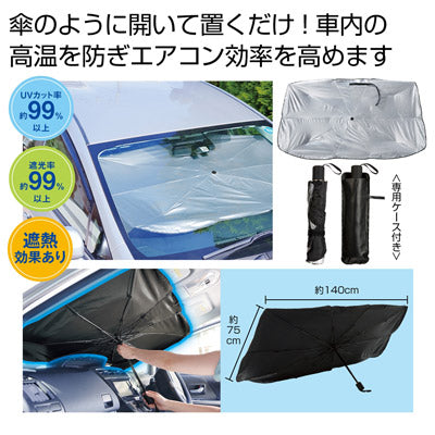 傘のようにパッと開いて置くだけ!車内の温度上昇を緩やかにし、エアコン効率を高めます。フロントガラスに吸盤の跡などが付かない傘タイプ。遮光率99%以上で遮熱効果もあるので車内温度の上昇も緩やかになります。専用の収納ケースには名入れ印刷ができるので、車購入特典など車関係のノベルティに最適です。CO...