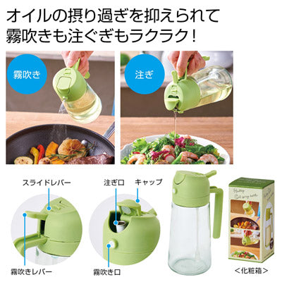 かけすぎ防止でヘルシーに!スプレーと注ぎの2WAY仕様のオイルボトル。レバーを引けばミスト状に広がるスプレー機能で、フライパンやサラダに少量のオイルをムラなく吹きかけ可能。余分な油をカットできるので、毎日の調理がぐっとヘルシーに。フタを開ければ通常の注ぎ口としても使え、ドレッシングや調味料をか...