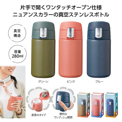 コーヒー一杯分容量のスリム形状ボトル。 ステンレス真空二重構造による保冷温力。 名入れがしやすいブラック単色で使いやすい。